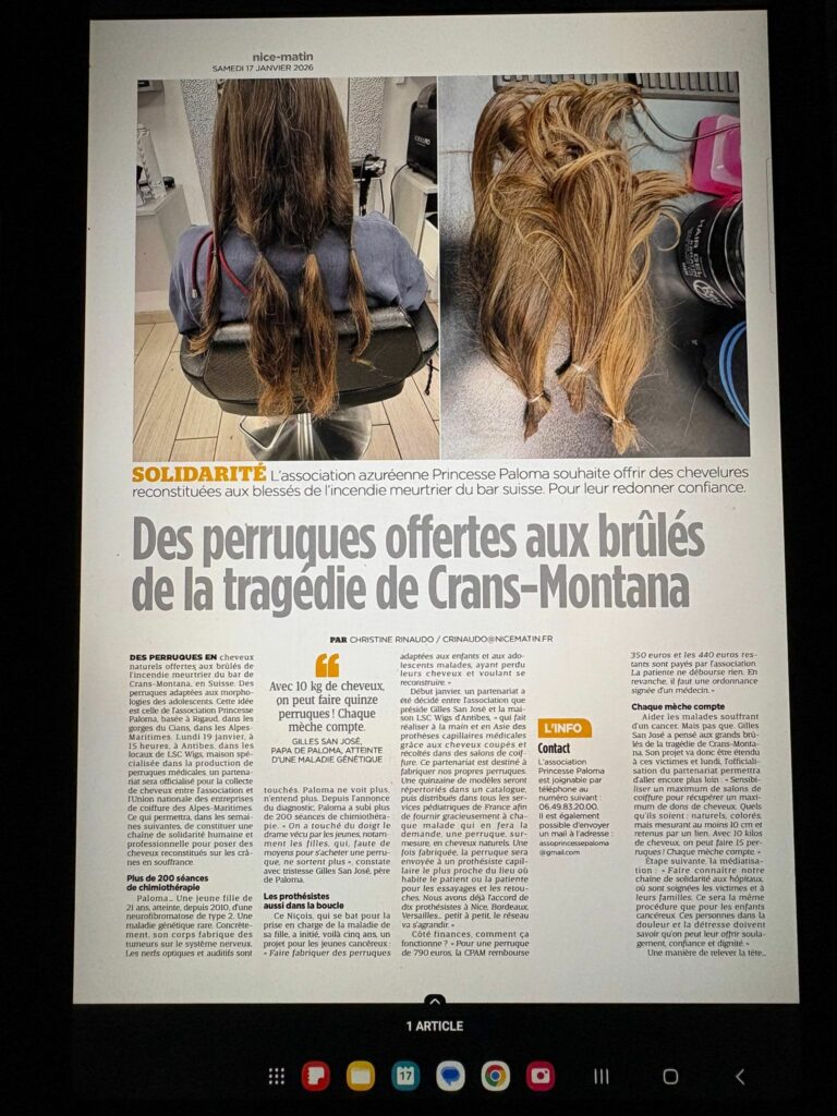 Un article de Nice-Matin relate la mobilisation d’une association des Alpes-Maritimes qui sensibilise salons de coiffure et public afin de récolter des dons de cheveux pour offrir des perruques aux grands brûlés de Crans-Montana.