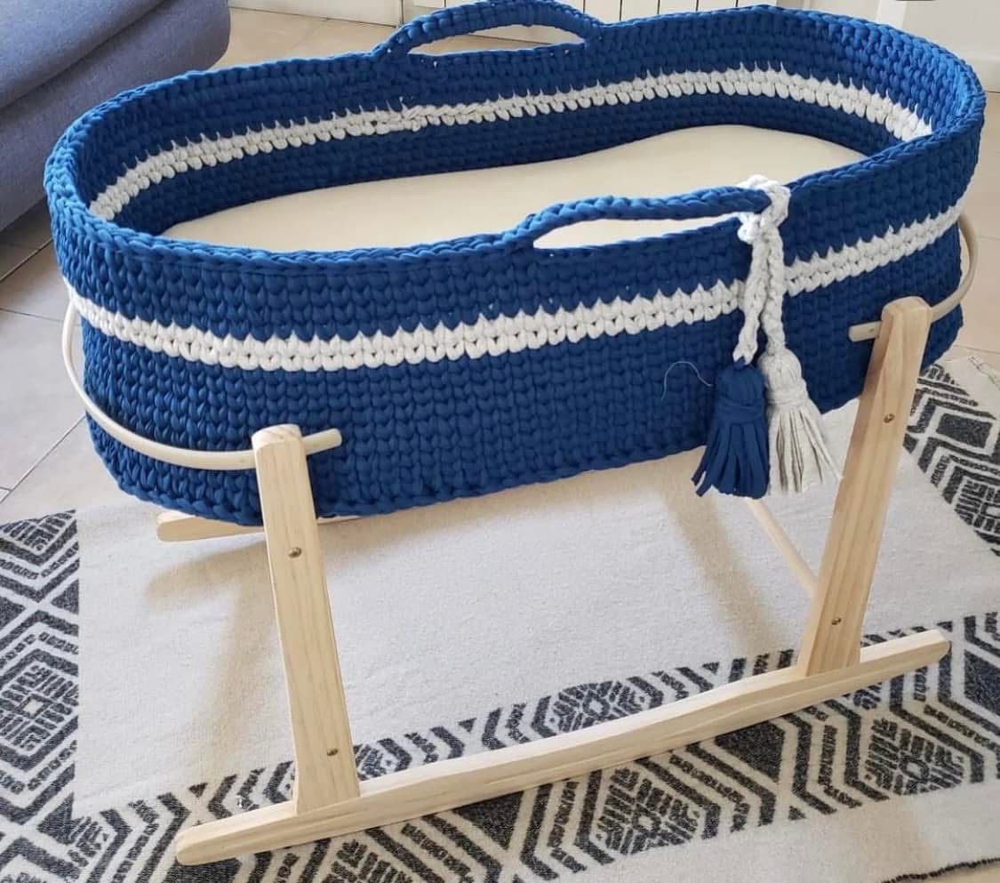 De ce fait, nous avons enlevé le lit à barreaux en métal pour le remplacer par un joli couffin au crochet fait à la main.