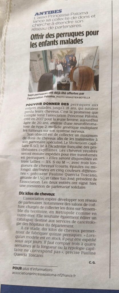 Un article de Nice-Matin présente l’initiative de l’association Princesse Paloma qui lance officiellement une collecte de dons de cheveux pour fabriquer des perruques médicales destinées aux enfants malades.