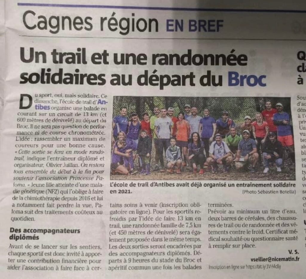 Nice-Matin. Trail et Randonnée solidaire au profit de notre association organises par l’école de trail d’Antibes